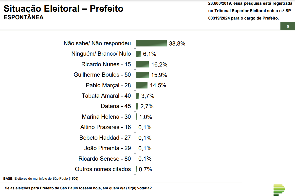 Quando o cenário espontâneo é apresentado aos eleitores da capital paulista, o atual prefeito também aparece ligeiramente à frente. Nunes soma 16,2%, enquanto Boulos chega a 15,9% e Pablo Marçal tem 14,5%. Tabata Amaral chega a 3,7% e Datena figura com 2,7% das intenções de voto.