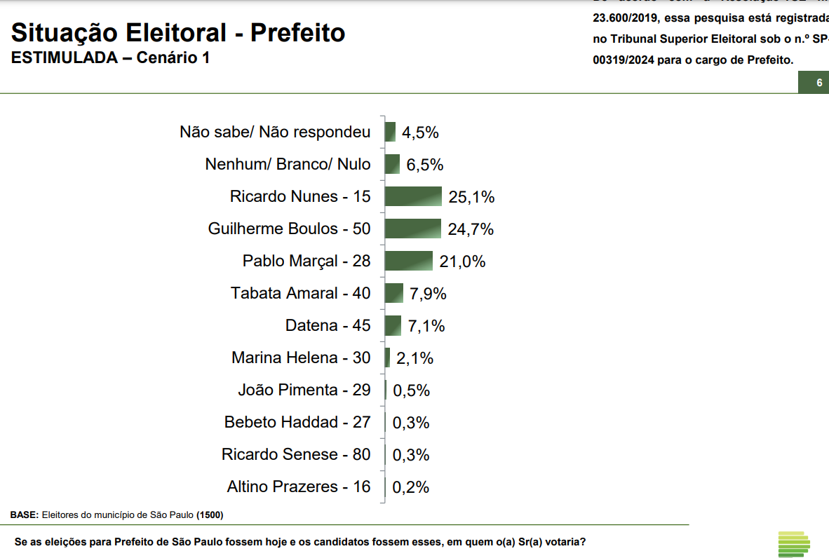 Segundo a pesquisa, o atual prefeito da capital paulista, Ricardo Nunes, aparece com 25,1% das intenções de voto. Ele é seguido de perto por Boulos (24,7%) e Pablo Marçal (21%). A disputa tem ainda a deputada federal Tabata Amaral (PSB) com 7,9% e Datena (PSDB) soma 7,1%.