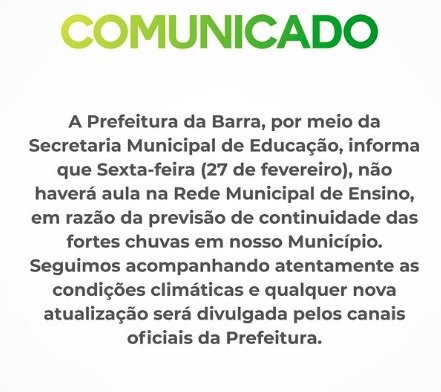 A prefeitura de Barra, na região do Velho Chico, Oeste baiano, segue com as aulas da rede de educação suspensas nesta sexta-feira (27). Um comunicado da prefeitura municipal informou sobre a continuidade da suspensão, reforçando que o município segue em alerta de chuvas intensas.